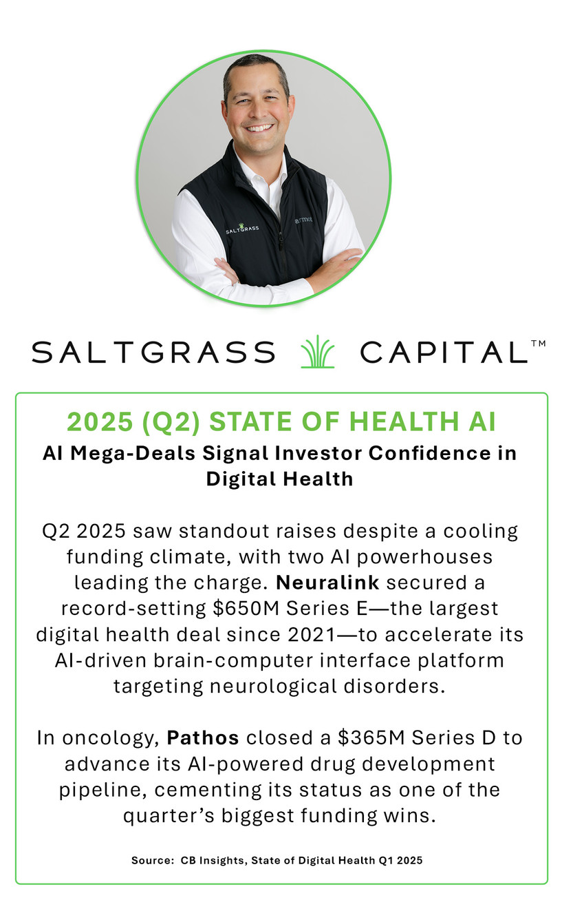 The quarter’s largest raise came from Neuralink, securing $650M in a Series E round to advance its AI-powered medical brain–computer interface platform. This single raise marks the biggest digital health deal since 2021, underscoring that investors are willing to back moonshot technologies with transformative potential.